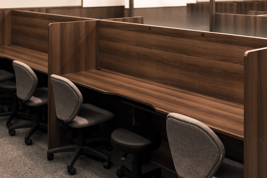 パーテーションで仕切られたブース式の自習室を全教室に完備しています。机や椅子、照明にも徹底的にこだわり、集中できる環境を整えています。質問しやすい雰囲気ですので、受講していない科目や学校の課題も講師に質問でき、わからないことをその場で解決することができます。